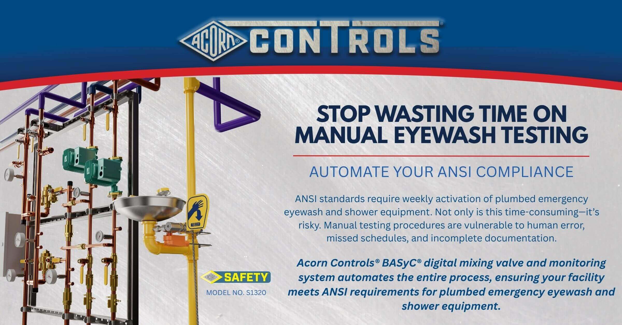 A new Acorn ConTrols®flyer highlighting the BASyC®digital mixing valve and monitoring system for emergency eyewash and shower stations.