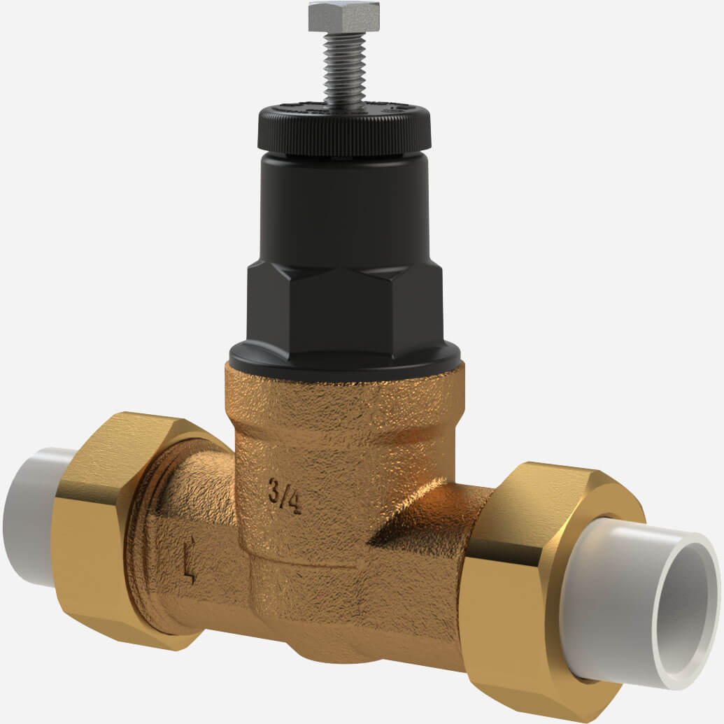 RV03 Series Water Pressure Reducing Valves are designed to regulate incoming potable water pressure to protect plumbing system components and reduce water consumption. The valve is suitable for supply pressures up to 400 psi (27.6 bar), is factory set to 50 psi, and may be adjusted from 10 to 75 psi (69 to 517 kPa). Optionally available with factory preset pressure to suit customer requirements (must specify).