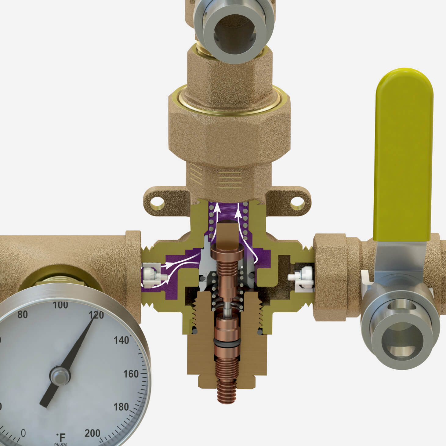 The TempFlow ® thermostatic balancing valve automatically maintains the temperature of the domestic hot water system. Install it after the last hot water device in each recirculating loop, and it will self-adjust to balance the recirculated flow and heat loss of each TempFlow-controlled zone.